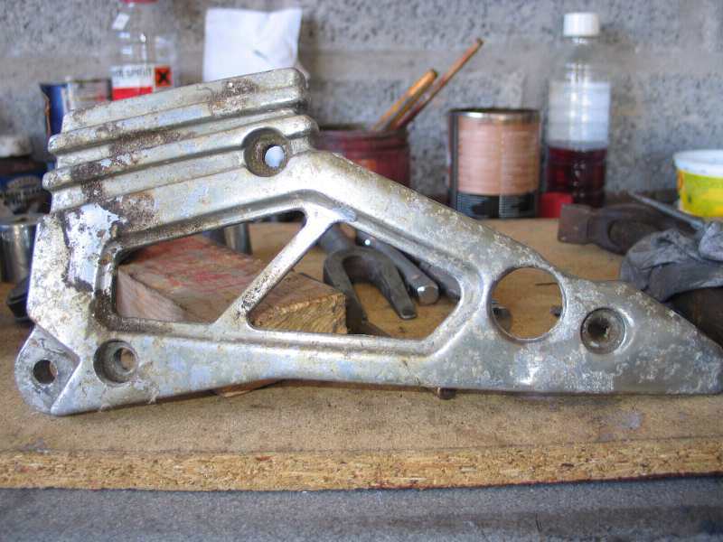 This time I have had more success as I started with a brass wire brush in my drill! A little radical but then, the Alloy parts are in a bit of a mess. I have no picture of the before grab rail so I will show you the rear footrest hanger instead. The grab rail was worse!!