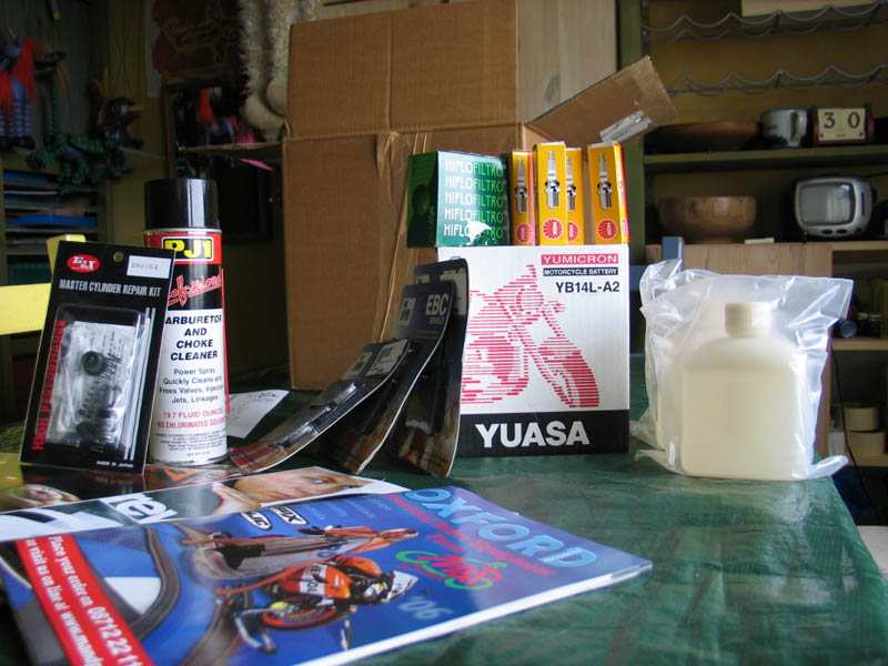 Including a new battery and acid for that, an oil filter, spark plugs, carburettor cleaner, brake pads and a rear masyter cyl repair kit, and so, that's what I did in the Garage yesterday.
