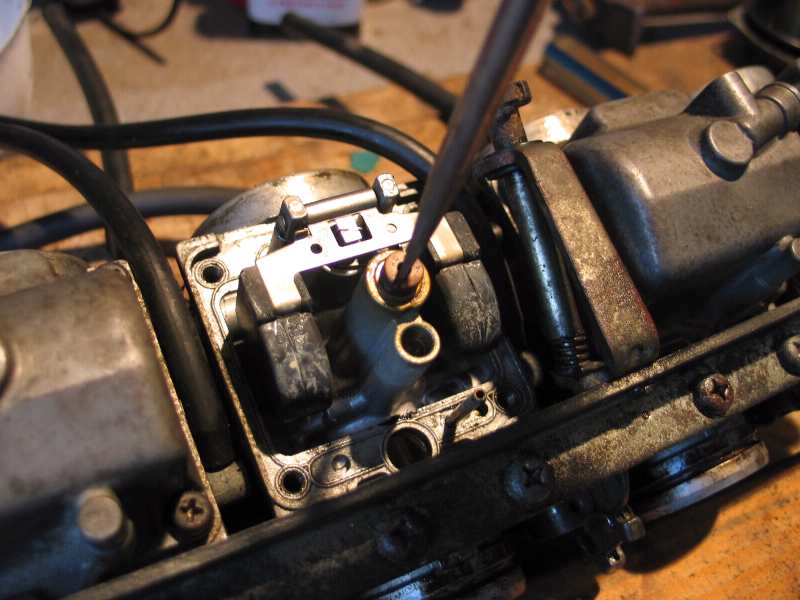 I spent some time manufacturing a screwdriver to remove the pilot jets this time. I filed down a screwdriver which was too big originally to get in to the pilot jet recess. This time I managed to remove all four pilots and found all of them choked with that brown varnish stuff! No wonder I was having problems.